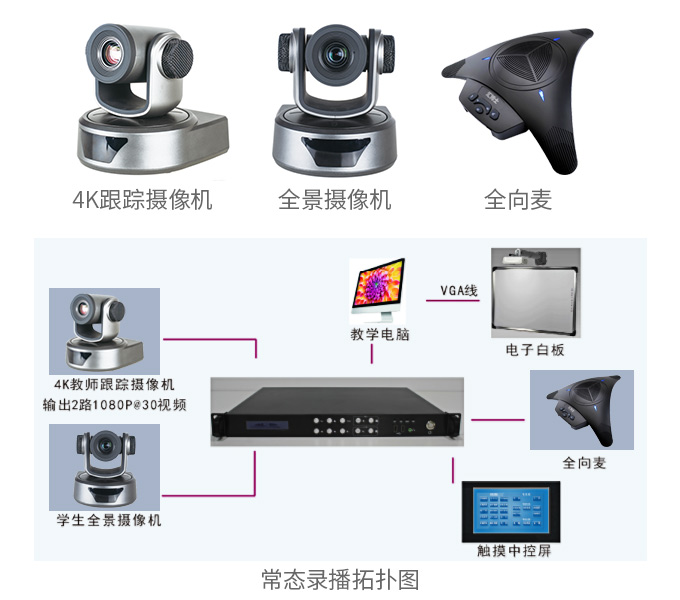 常态化录播系统由录播云平台、嵌入式智能录播主机、教师摄像机和学生摄像机、高质量全向麦克风组成。